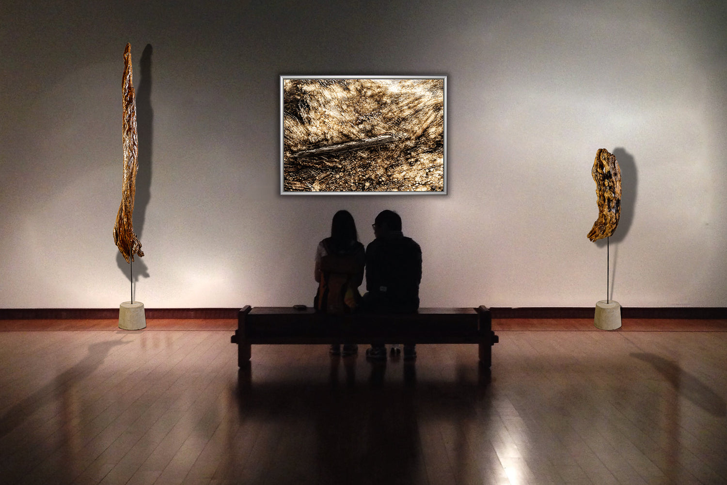 Sie bestehen aus einem zentralen Treibholz Corpus mit speziellen Echtholzfurnier Lichtschirm. Als moderne Lichtinstallation ist diese auf einen Sichtbetonsockel befestigt.