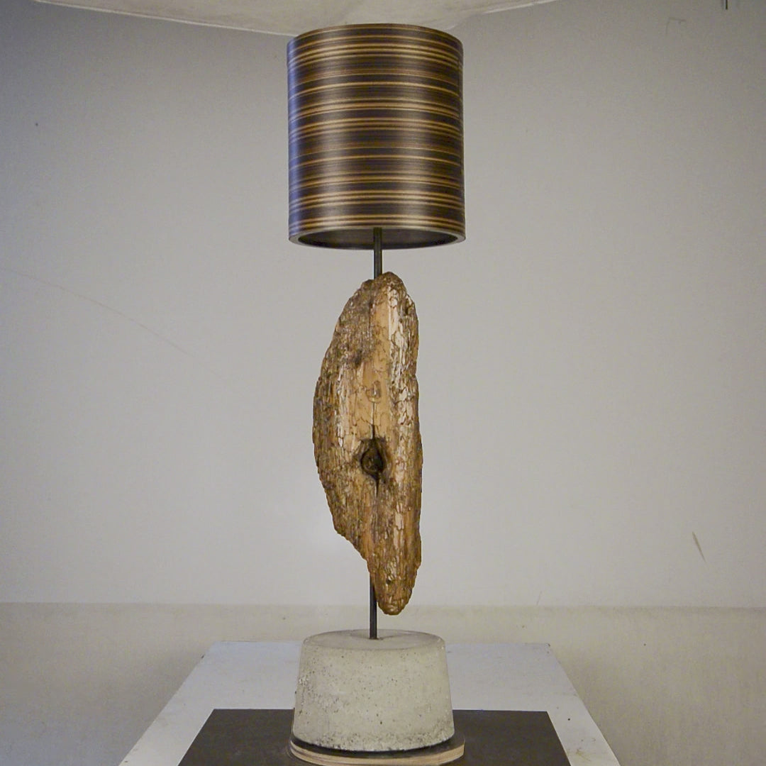 - Materialien: Treibholz (Bergkiefer), Mebala-Furnier, Sperrholzringe, Sichtbeton, Metall (brüniert)